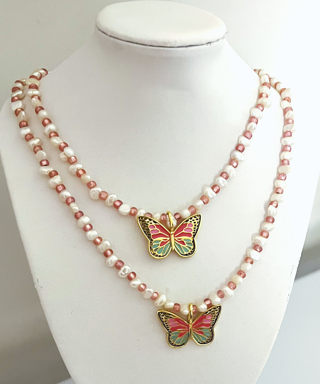 This beauty is made out of freshwater pearls, seed beads and an 18k gold butterfly pendant.